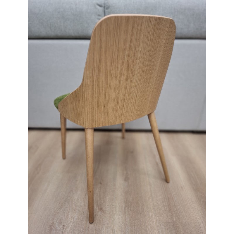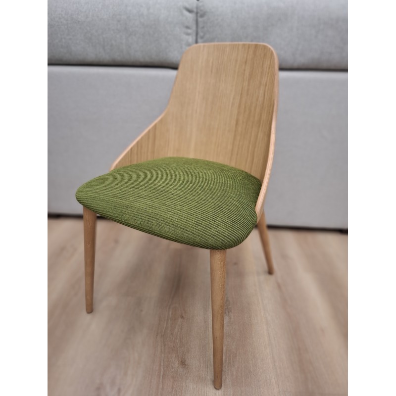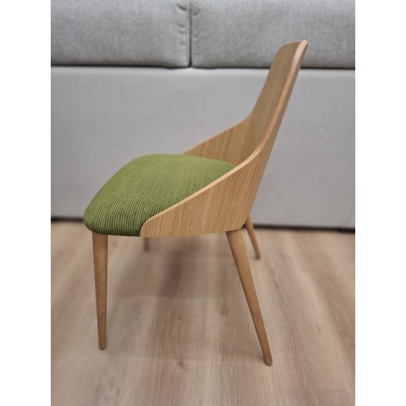 Las patas cónicas de madera y su respaldo en chapa de roble, le aportan calidez a la silla, su confortable asiento invita a seguir sentado en ella.